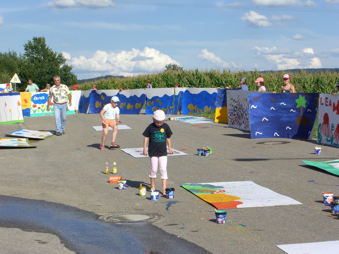 Das längste Bild Plößbergs Zur 4. Veranstaltung im Rahmen des Ferienprogramms des Plößberger Vereinskartells hatte die Reservistenkameradschaft Plößberg in die Waldstraße zum Malen unter dem Motto „Das längste Bild Plößbergs“ eingeladen; 38 Kinder im Alter von 6 bis 12 Jahren nahmen teil. Die Kinder konnten hierbei ihre Kreativität im malen von Bildern zum Ausdruck bringen. Gemalt wurde mit Farbe und Pinsel auf große Kartonagenplatten. Hierbei wurden Gewässer mit Fischen, Strandpromenaden, Blumen, Sonnenbilder und vieles, vieles mehr von den Kinder mit großer Begeisterung und künstlerischen Engagement gemalt. Besonders hervorzuheben ist hier zum einen Herr Bernhard Schön vom Liebensteiner Kartonagenwerk welcher die große Anzahl von Kartons gesponsert hat und zum anderen Herr Fleischmann von der Firma Fleischmann Werkzeug & Maschinen GmbH, welcher sowohl den Transport der Kartonagen gemacht und zum anderen auch seine Halle für die Vorbereitungsarbeiten zur Verfügung gestellt hatte. Die Kinder malten in drei nebeneinander liegenden Reihen mit Eifer und Freude und holten sich immer weitere Kartonagenplatten, wenn sie eine bemalt hatten. Am Schluss präsentierten sie mit Stolz ihre Kunstgemälde.